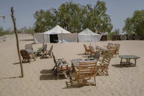 Pour répondre à ces impacts, GCO s’est lancée dans le projet fou de construire une « oasis du désert » de toutes pièces, sur un terrain où est déjà passée la drague, à dix kilomètres du site touristique actuel. Le chantier, encore en cours, a commencé en juillet 2022 et doit se terminer avant que les campements ne ferment pour éviter l’interruption du tourisme. « Nous avons reconstitué la dune originale, planté une palmeraie sur huit hectares, avec au milieu un plan d’eau de 2 000 m2. Nous allons aussi aménager le littoral qui n’est pas loin », détaille Samba Fall, chef du projet pour GCO.