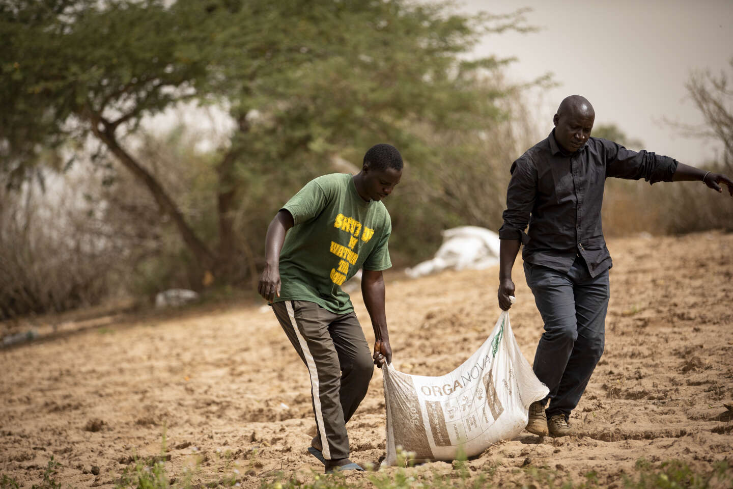 Elimane Gningue appui son frère Thierno Gningue dans les activités agricoles. Ici, transport des sacs de fertilisants organiques.